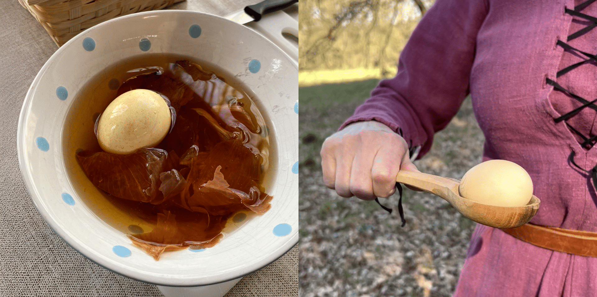 – brug fx løgskaller, rødbede og andre naturlige farvestoffer